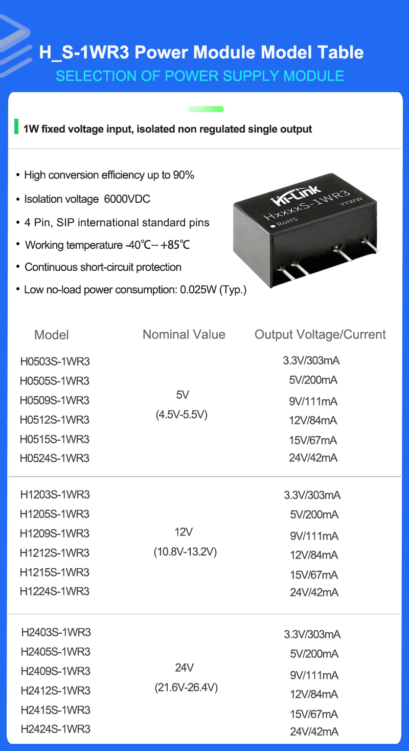 H0505S-1WR3/H0503S/H0512S/H0515S/H0524S-1WR3 DC to DC 5V to 3.3V/5V/9V/12V/15V/24V 1W power module/converter module single output