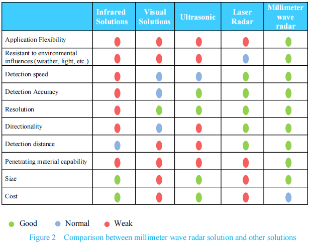 LD2450 human body sensing module adopts 24GHz millimeter wave radar sensor technology, compared with other programs, has obvious advantages in human body sensing applications: