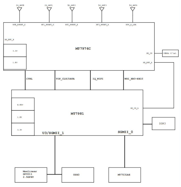 The SoC used is manufactured using advanced silicon technology and integrates dual core ARM ® Cortex-A53MPCoreTM, working up to 1.3GHz frequency and more DRAM bandwidth. It also includes various peripherals, including SGMII and USB3.0 (host) port. two 2.5Gbps HSGMII Ethernet interfaces have also been implemented. MT7981B, combined with RF chips, can provide