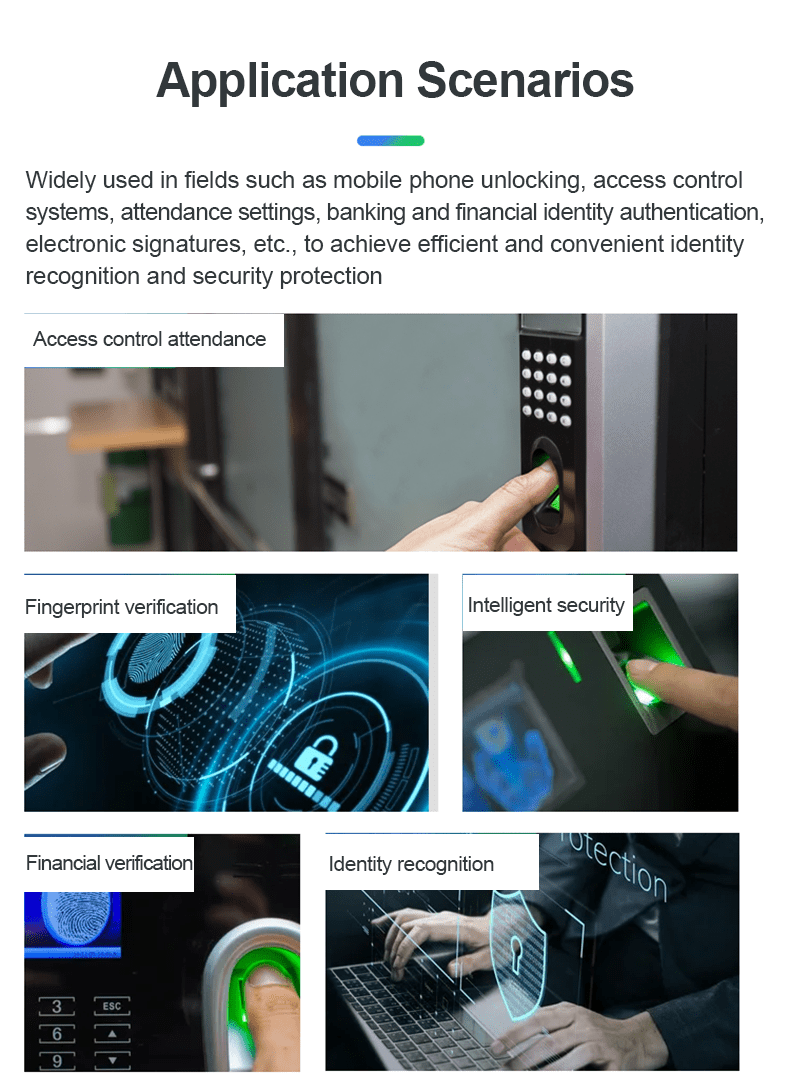 The fingerprint recognition module is used to determine the user's identity. When the user touches the fingerprint recognition module with his finger, the fingerprint recognition module will scan the user's fingerprint. The algorithm chip can obtain the fingerprint image data for registration and comparison operations. This product is suitable for various occasions requiring fingerprint recognition.