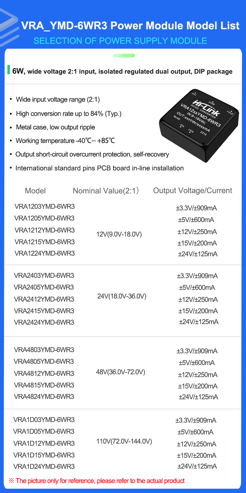 VRA4812YMD-6WR3 Hi-link dc-dc 6W VRA4803/VRA4805/VRA4815/VRA4824YMD-6WR3 voltage stablization dual output power converter module