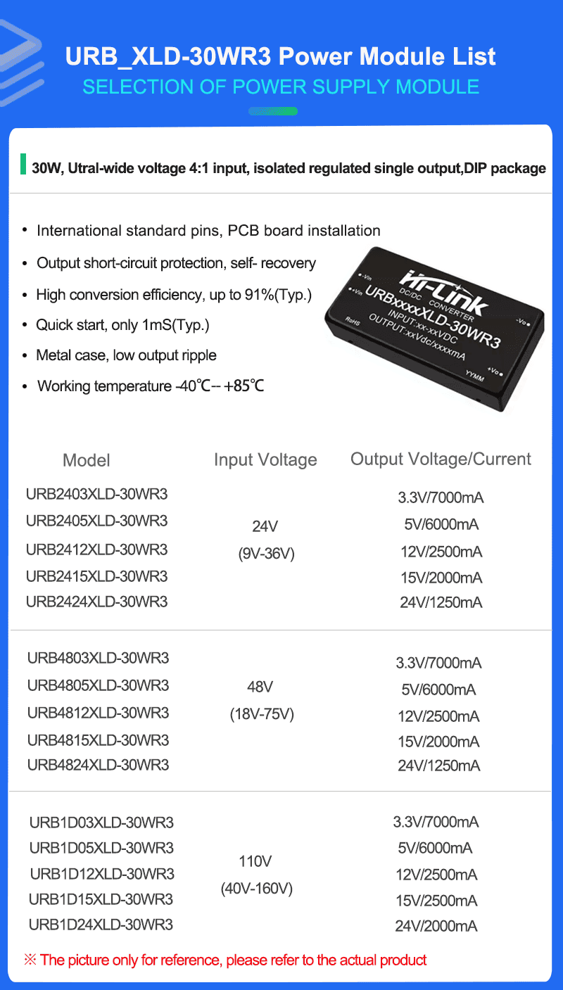 UR(A)B_XLD-30WR3 series product output power is 30W,4:1 wide voltage input range,efficiency up to 91%,conversional isolation volatge of 1500VDC,allowable operating temperature is -40℃to+85℃, with input under-voltage protection, output over-voltage, over-current,short-circuit protection function, bare metal meets CISPR32/EN55032CLASSA , widely used in medical, industrial control, electri power, instrumentation,communication, railway and other fields.