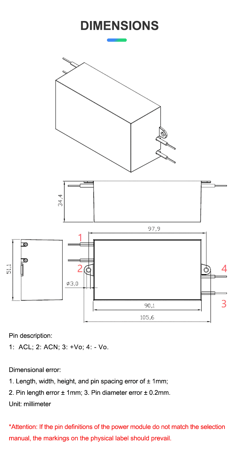 Output ripple and noise (mVp-p) | ≤100 Rated input voltage, output at full load. Use a 20MHz bandwidth oscilloscope to test the load end with 47uF and 0.1uF capacitors. | mV | |