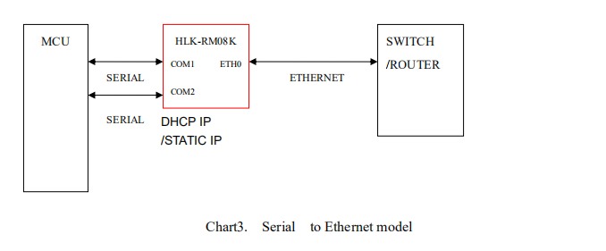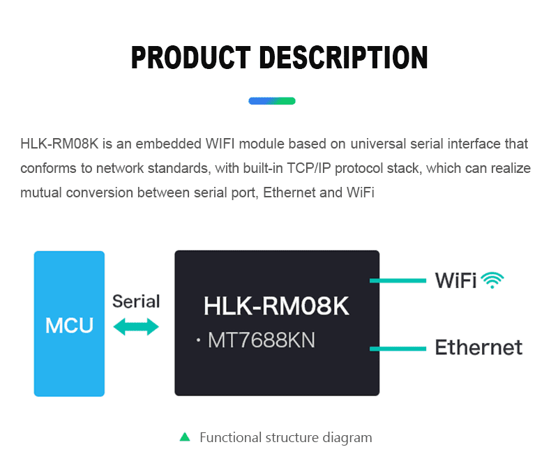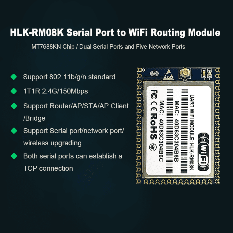 HLK-RM08K is a new low-cost embedded UART-ETH-WIFI module (serial port - Ethernet - Wireless network) developed by Shenzhen Hi-Link co., Ltd This product is an embedded module based on the universal serial interface network standard, built-in TCP / IP protocol stack, enabling the user serial port, Ethernet, wireless network (wifi) interface between the conversions. Through the HLK-RM08K module, the traditional serial devices do not need to change any configuration; data can be transmitted through the Internet network. Provide a quick solution for the user’s serial devices to transfer data via Ethernet.