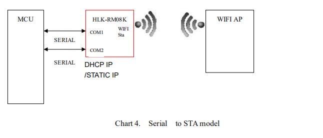 In this mode, WIFI enable, module works in the STA mode, ETH function close. WIFI STA can be configured as dynamic IP address (DHCP), can also be configured as static IP address (STATIC).