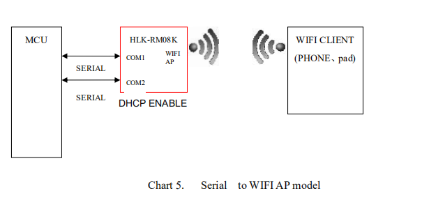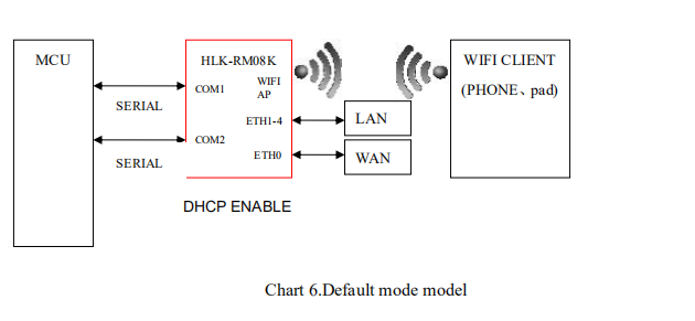 In this mode, WIFI enable, module works in the AP mode, ETH function close. In this mode, WIFI device can connect with the module and become the device under WIFI LAN.