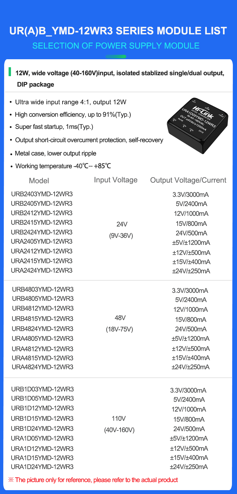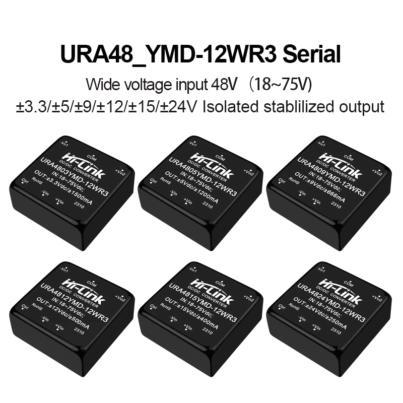 URA4805YMD-12WR3 URA4812YMD/ URA4824YMD DC-DC isolated stablized dual output 48V to 5V/12V/15V/24V power converter module