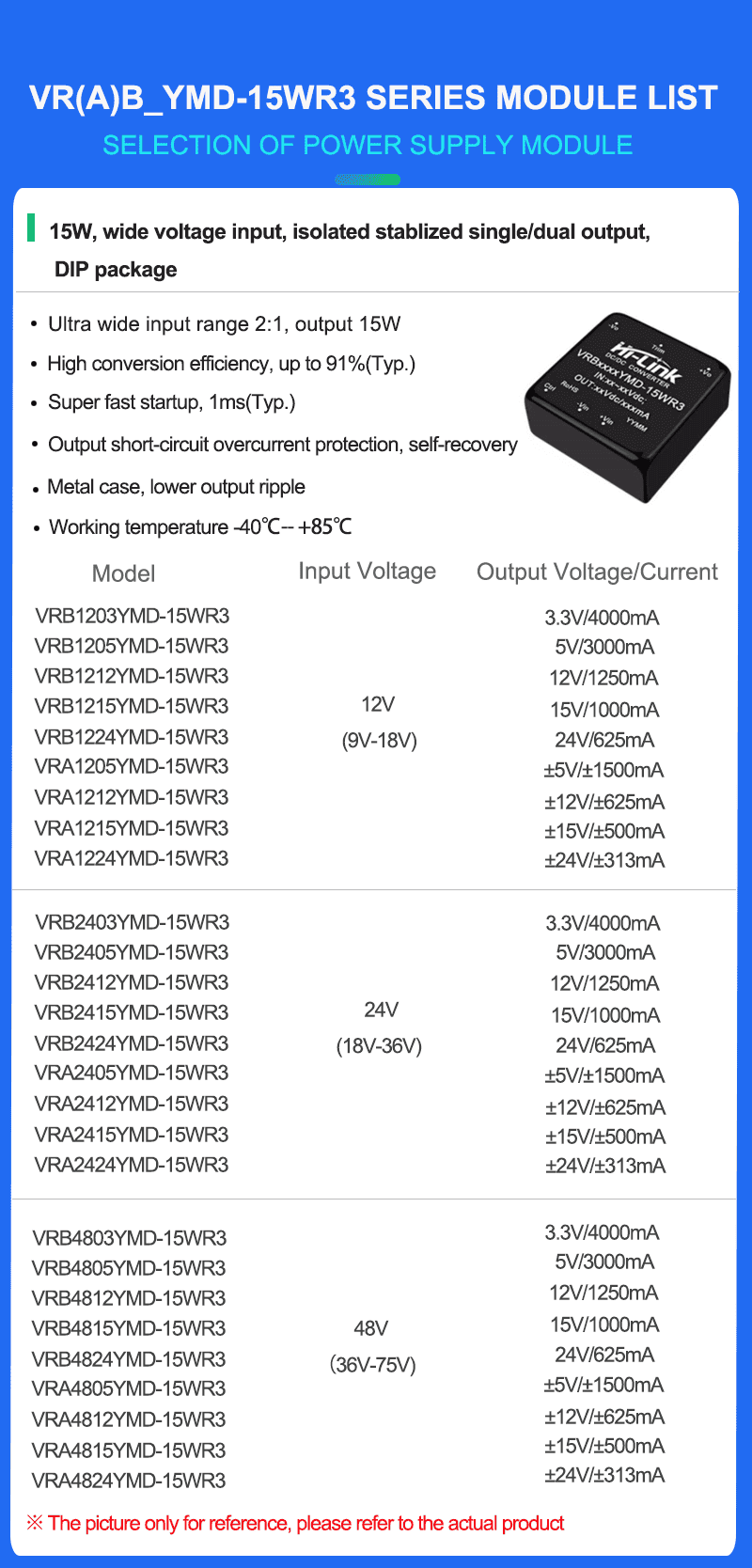 VRB2405YMD-15WR3 VRB2412YMD/ VRB2415YMD/VRB2424YMD DC-DC isolated dual output 24V to 5v/12v/15v/24v power converter module