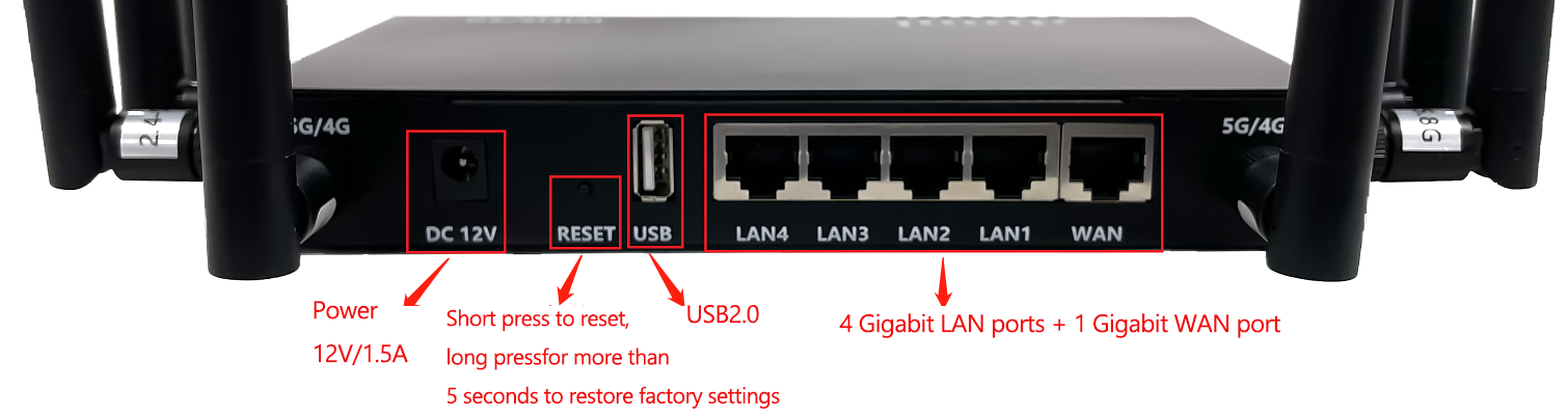 Antenna interface | 2.4G/5.8G WiFi:SMA External screw inner needle *4 2G/3G/4G/5G netword :SMA External screw inner hole*4 |